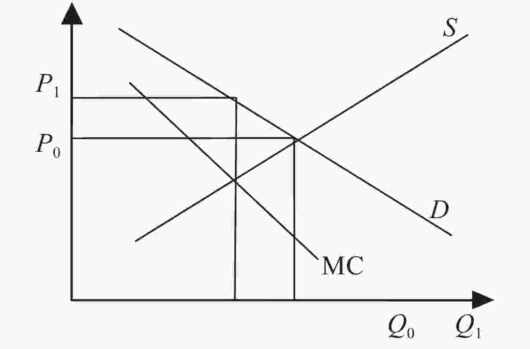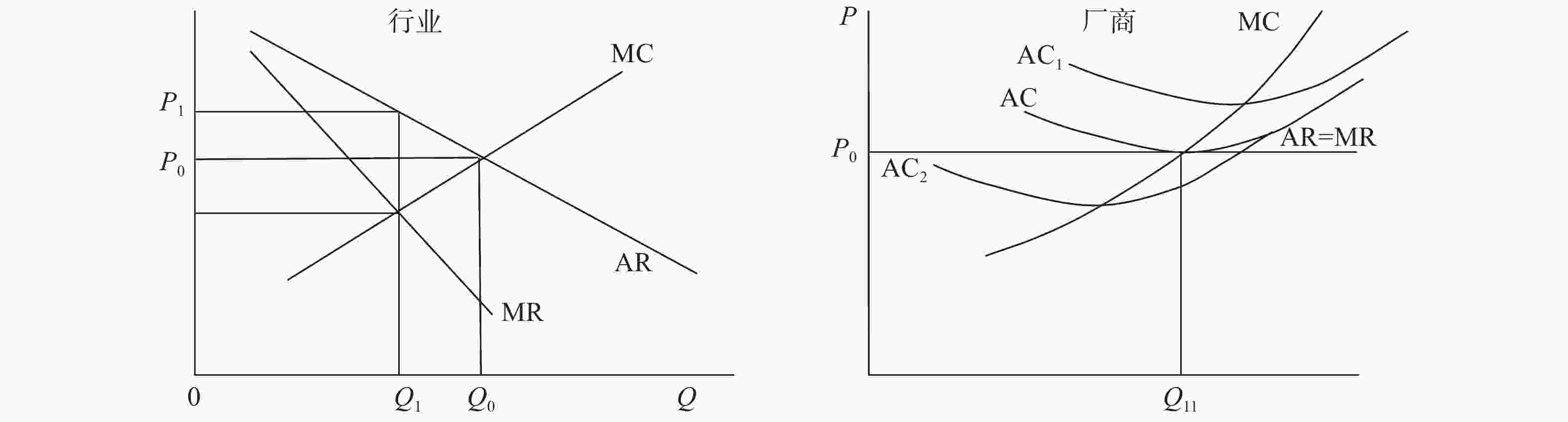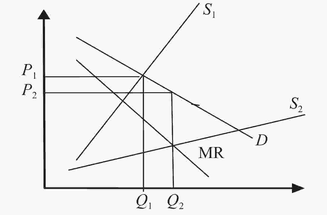 从图2可见,当某种产品全部由垄断供给,价格为P时的产量是Q(市场经济中,价格水平决定需求量,需求量决定实际产量)。现假设该产量由两个寡头垄断厂商供给,各自占市场总量的一半,那么价格将为P1。在实际中,由于价格上升,社会需求量将减少,即小于Q,由此每个厂商的供给量将小于Q1,或者说市场总供给量小于完全垄断产量Q,市场价格将高于P1。这也就是说,所有寡头垄断厂商的产量之和小于完全垄断的产量,价格水平则高于后者。