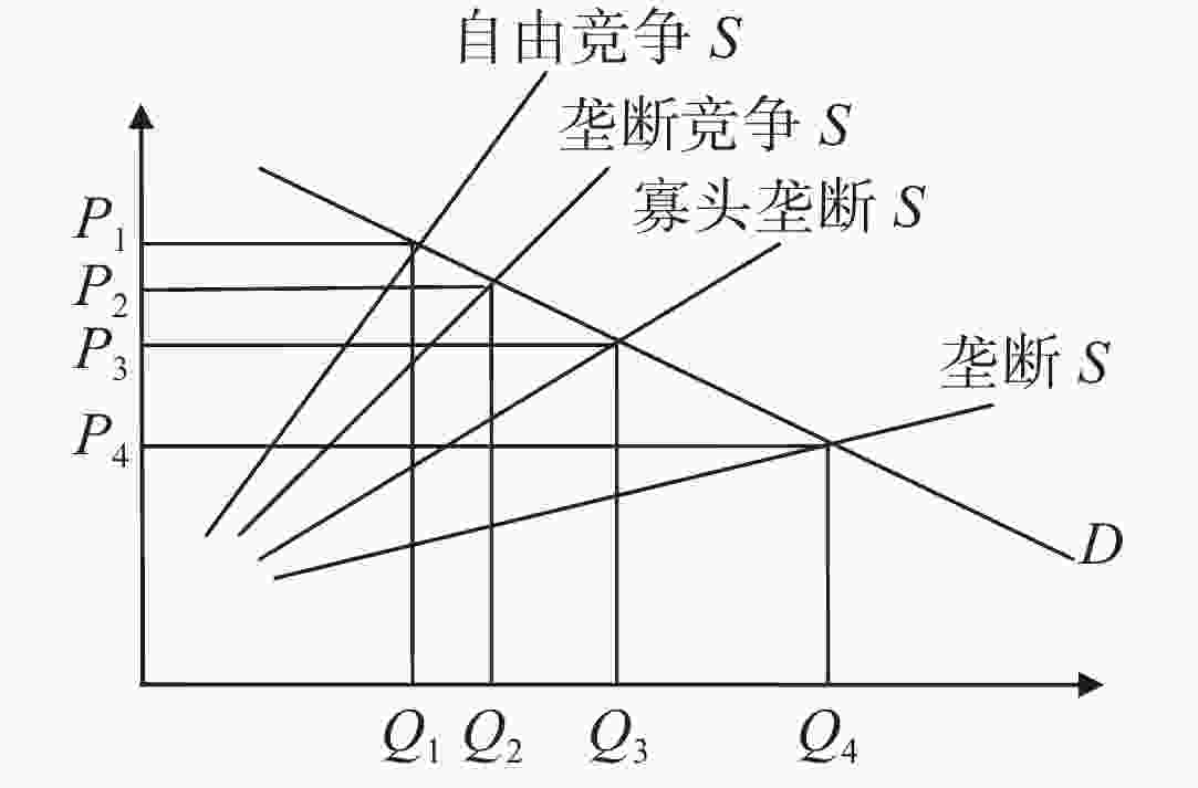 在社会资源一定时,无论一种产品的供给由何种市场结构主导,它的需求曲线是完全相同的,由此该产品的价格与产量就取决于成本水平的高低了。假设四种市场结构各自的成本曲线如图4所示,那么会得到不同市场结构对应的产量与价格水平。
