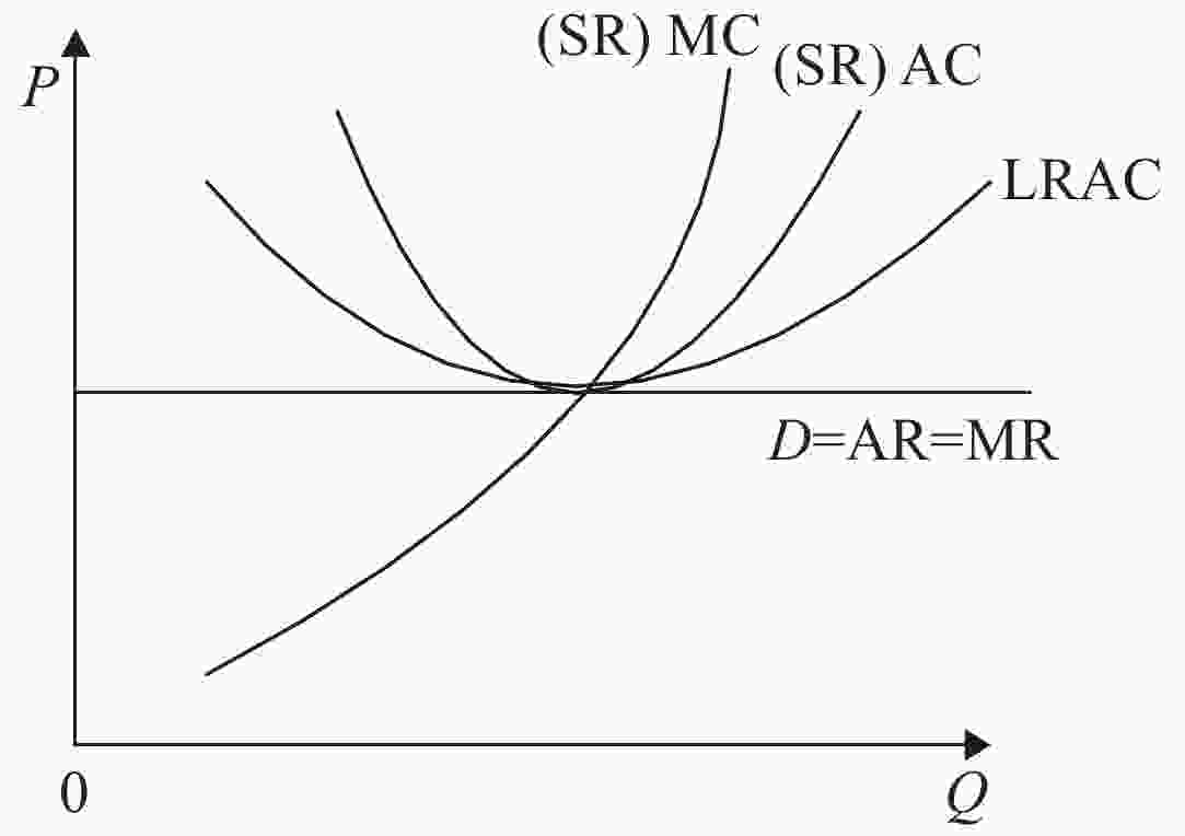 自由竞争能够实现最优资源配置,除了认为它的产量最大与价格最低外,就是它比其他市场结构能够实现资源配置的均衡,即在这里,厂商的平均成本、边际成本与价格相等,消费者与生产者之间的得失相等,同时从图5中看到,厂商的均衡与行业的均衡是对应的。虽然因市场的不均衡,厂商在短期有可能获得净利润或净亏损,但由于自由竞争的门槛很低,进出方便,因此能够很快实现长期均衡(见图6)。