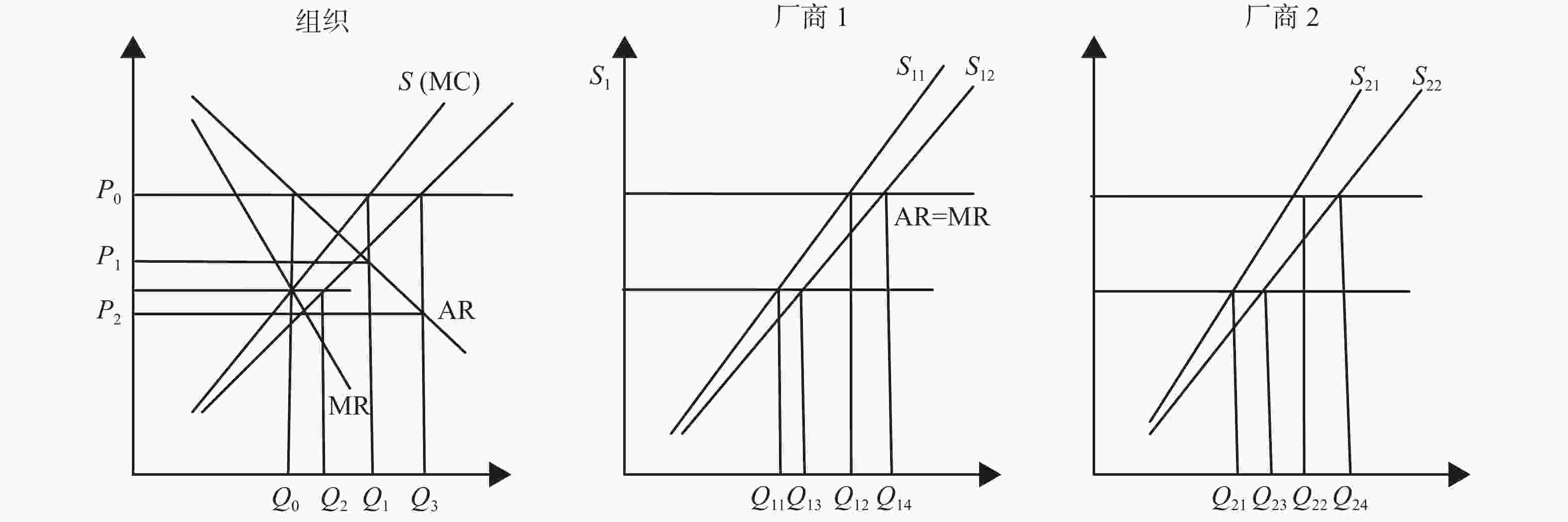 由于行业与厂商之间在成本性质上存在差异,不仅自由竞争和垄断竞争中存在这种行业与厂商利益不一致导致的资源配置非均衡,而且在寡头垄断中也是如此。如在“共谋的瓦解”模型中,当卡特尔组织根据利润最大化原则在各厂商间分配产量,也就是“组织”的边际成本与边际收益相等,然后以各厂商在该边际成本位置确定产量,由于厂商是第四要素价格的接受者,因此它们的供给曲线弹性要大于“组织”(图7中,厂商实际供给曲线分别是S12、S22),它们叠加形成的“组织”实际供给曲线是S1,由此厂商各自根据组织要求以边际成本确定的产量分别是Q13、Q23,而不是原来的Q11、Q21,两者之和(Q2)要远大于预计的产量Q0,这也就是说,由于行业与厂商之间成本性质的不同,因此即使各厂商完全根据“组织”要求来配置资源,也会导致卡特尔组织意愿的落空。显然,在这样的基础上,以利润最大化为追求目标的厂商的最终产量分别是Q14、Q24,其叠加的“组织”产量将达到Q3,价格将下降P2,“组织”目标被彻底破坏。