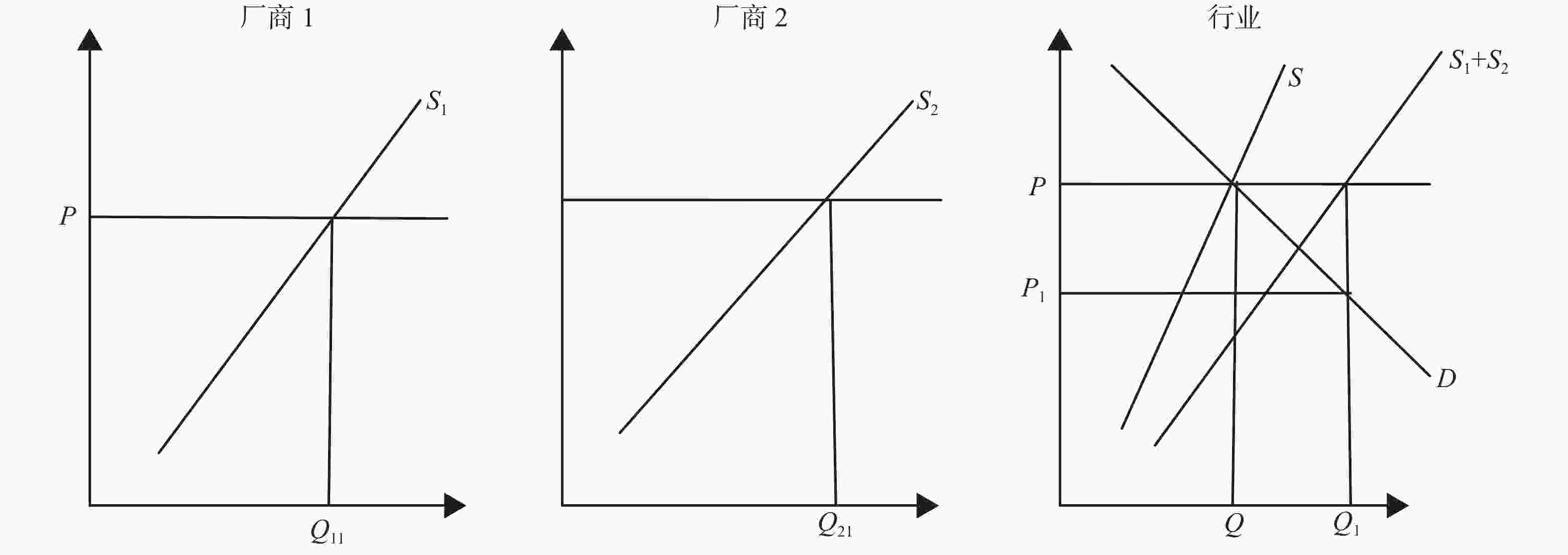 上面讲到,行业是第四要素,即厂商从其他厂商那里购买的各种投入品价格的决定者之一(另一者是其他行业的供给状况),面对的要素供给曲线是向上倾斜的,厂商则是价格的接受者,要素供给曲线是水平的;厂商的资源配置只考虑技术因素的约束,行业则还要受到要素供给的约束,这种情况导致行业的供给曲线并不是厂商供给曲线的水平叠加,它们之间的关系如图9所示。也就是说,受(第四要素)供给的约束,行业的供给曲线是S,而作为价格接受者的厂商供给曲线的集合却是S1+S2,即当行业供求处于均衡(产量为Q,价格为P)时,厂商根据行业状态配置资源的结果将导致产品供给量远远大于行业供给量,结果导致行业供给远大于需求,价格下降到P1,行业均衡被严重破坏。