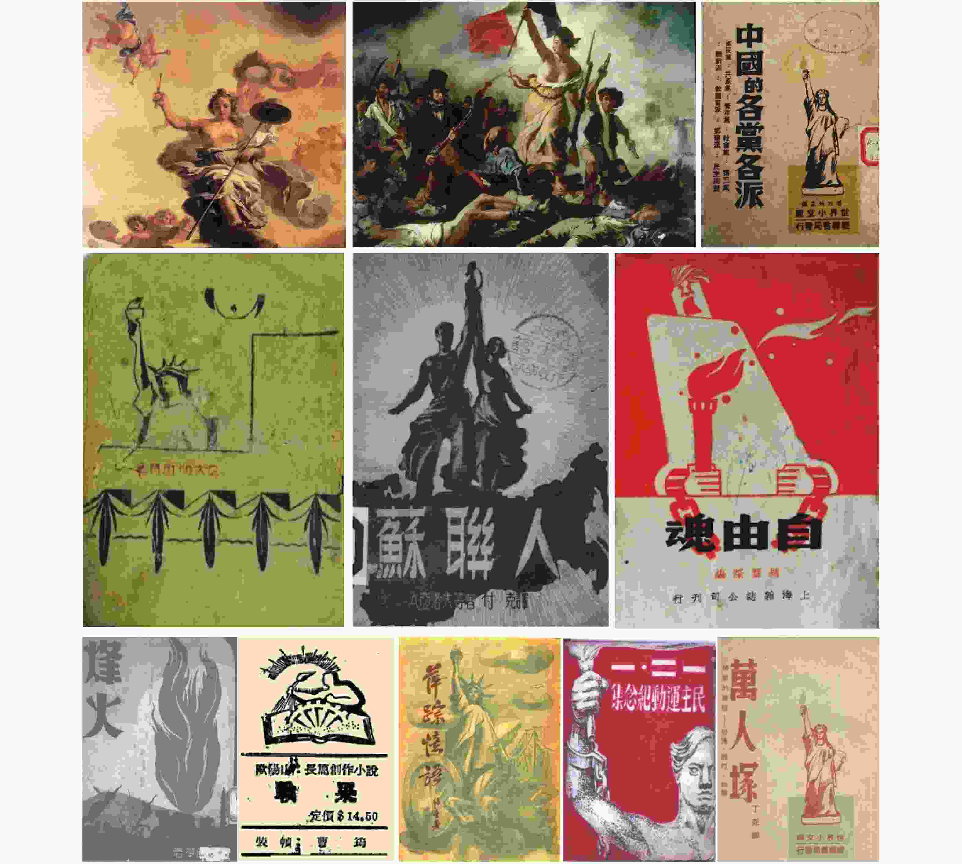 中国现代自由观念并非始于20世纪三四十年代,早在清末就由启蒙思想家梁启超等人大力提倡,意在反对封建专制,提倡言论自由、出版自由、结社自由等三大自由。三四十年代“自由魂”图像则并不尽然,具有新的时代意义,主要诉求是对外追求民族解放,对内反对国民党政府的专制统治。“自由魂”图像模式并非原创,大都是对“前文本”的借鉴或借用。这就涉及到相关的历史文化资源。 追求自由是人类的长久梦想,该主题的绘画,由来已久。早在1672年,荷兰画家杰拉德·德·莱雷西(Gerard de Lairesse,1640—1711)就创作了油画Allegory of the Freedom of Trade,即《追求自由之寓言》。画面上,“自由女神”左手抱在腹部,并护住一根长棍,长棍上端顶着一顶草帽,右手则高高举起火炬,她袒露双乳,凌空奔跑。其后追随有小天使。该画给人以飘逸和轻松自由之感。到1830年,法国画家欧仁·德拉克洛瓦(Eugène Delacroix,1798—1863)创作了油画Liberty Leading the People,即广为人知的《自由引导人民》或《自由女神》。自由女神左手提着长枪,右手高举旗帜,袒露双乳,带领队伍奋勇前进。她边跑边回顾战友。其队伍人数甚众,个个持枪举刀,气势庞大。它描写了当时巴黎人民反对波旁王朝而奋起战斗的场面,给人以强烈的震撼力。这幅油画流传甚广,影响甚大,既是受压迫国家与民族追求解放的文化资源,又是受压迫人民推翻专制政权的精神动力。到1876年,法国著名雕塑家巴托尔迪历时10年艰辛完成了一幅雕像,这就是坐落于美国纽约自由岛的《自由女神像》。它以法国塞纳河的自由女神像作蓝本。女神身着古希腊风格的服装,头戴有象征世界七大洲的七道尖芒的头冠,右手高举象征自由的火炬,左手捧着一本法律典籍(封面刻有“1776年7月4日”字样),脚下是打碎的手铐、脚镣和锁链。她被视为挣脱暴政的约束,自由照耀世界的象征。该雕像是法国在1876年赠送给美国的独立100周年礼物。它有两重意义,一是抨击当时法国第三共和国内的帝制势力;二是支持美国独立战争,肯定自由理念。⑫这一系列“追求自由”的图像化文化资源,成为后世可资借鉴的重要财富。 我国现代作家、翻译家以及美术家根据中国现代社会发展的客观状况,及时地创作或翻译文学作品,并适时配备相应的封面图,以表达对自由的追求。可称为“自由魂”模式的有梅子的小说《争自由的女儿》(上海出版合作社1929年)封面图、沈西苓的《烽火》(一般书局1938年)封面图、欧阳山的《战果》(桂林学艺出版社1942年)的扉页图、上海经纬书局1945年出版的《世界小文库》丛书的统一封面图、付克译的《苏联人》(东北书店1949年)封面图等二十余种。大体有两种形态,一是直接借用“自由女神像”,如《争自由的女儿》封面图、《世界小文库》丛书的统一封面图;二是“自由女神像”的变体,如改编剧《自由魂》、译作《苏联人》等的封面图。这些“自由魂”图像表达了人们对自由的热烈追求,反映了时代潮流。 《争自由的女儿》是文学青年朱梅的小说,出版于30年代前夕;《自由魂》是赵景深之妹赵慧深改编的四幕剧,出版于30年代末期,二者最具代表性。前者体现的是争取个人自由,后者体现的是争取民族自由。《争自由的女儿》封面图的主体部分是“自由女神像”的上半截,其他部分主要起装饰作用。从图案设计上来看,该封面图并无多大创新,但其意义匪浅,反映了当时的社会思潮。封面图与作品内容十分吻合。该书反映了20世纪20年代末至30年代中后期一代青年的时代情绪,具有普遍性。作品的主旨“争自由”喊出了当时青年的共同心声。巴金在“序言”中说,小说使当时心情恶劣的他做了一个好梦。“心情恶劣”是因为他在“这个大时代”中只感到在沙漠上的寂寥,“悠长的岁月就在这不死不活的寂寥中过去了”。“好梦”是“争自由”,他说:“《争自由的女儿》给我带来了一个炸弹,它的爆裂声是我亲耳听见的。我如今是不再在这种寂寥中断送我的青春了。”⑬文学青年在白色恐怖的社会环境中深感窒息,“争自由”成为他们的共同追求。《自由魂》封面图是“自由女神像”的变体,画面上部三分之二是图案,下部三分之一是白色空白以及书名、改编者姓名和出版单位等文字。上部的背景是红色,一个高昂着头的男子上半身白色,其双手被戴上锁链,两臂紧紧抱在腰部,右手紧握火炬,红色的火炬与白色的身躯形成鲜明的对比。飘过身躯的火焰在红色背景上呈现白色,动感强烈。高昂的头在嘶声呐喊,红色的舌头与白色的脸庞形成鲜明的对比,其头发高耸,大有怒发冲冠之气势。颇有创意的是,男子白色的身躯又像一本白色封面的书,锁链、书本、火炬、呐喊的男子,这四个要素紧紧融合在一起,意味着富有力量的人们从书本中吸取知识,砸断锁链,高举火炬,挣脱压迫,获得自由。下部最重要的语言学讯息“自由魂”三个字在白色背景上凸显出来,并盖住从上部男子手腕垂下的锁链,大有自由压倒枷锁的寓意。这幅封面图尽管存在对“自由女神像”模仿的痕迹,但仍然大有创意。剧本《自由魂》改编自波兰作家廖·抗夫的《夜未央》,表现的是俄国数个青年男女、虚无党人为了革命不惜舍弃爱情乃至牺牲生命的动人故事。原作早就有李石曾的与巴金的汉译本《夜未央》,两个译本和一个改编本,三者各有侧重,或者说因为时代的感应