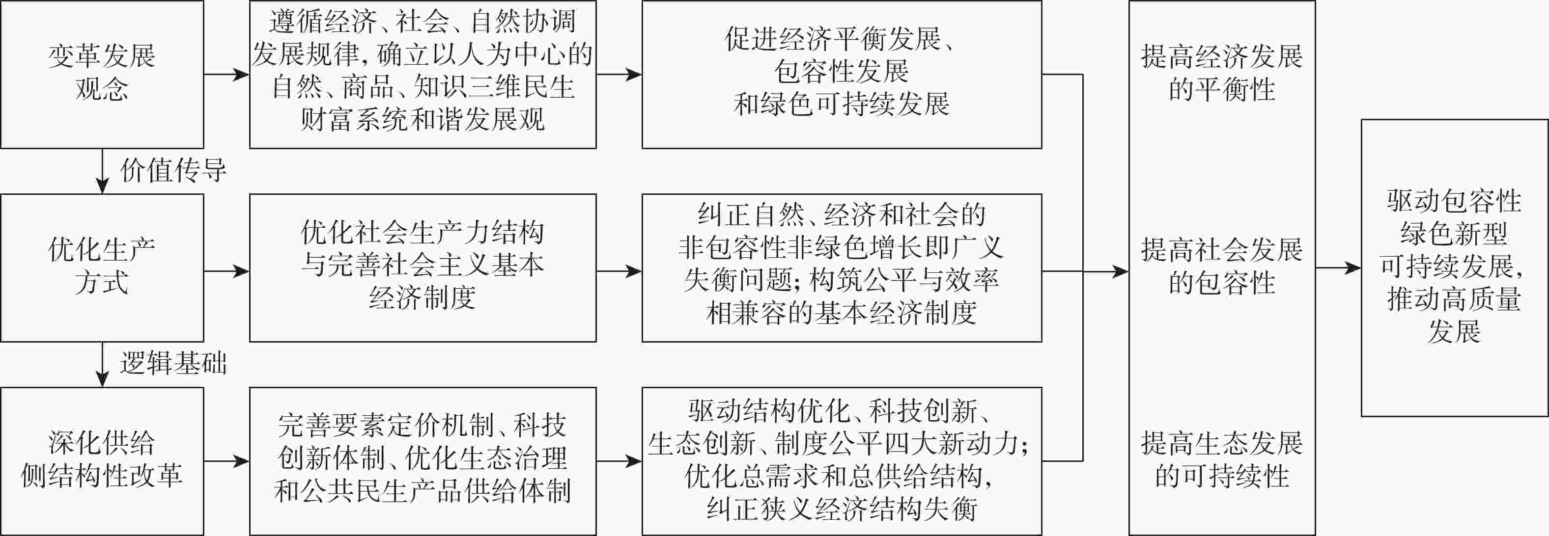 从驱动包容性绿色发展的完整制度体系而言,我们认为,既要通过转变发展观念与构筑、完善基本经济制度,以确立并夯实包容性发展的价值导向与制度基础,也需要改革、完善推动包容性发展的各项关键性体制机制,以构建有利于推动包容性发展的实施机制与体制保障。在经济新常态背景下,结构性问题不仅导致中国经济下行压力巨大,而且引发中国经济发展各类平衡问题和经济发展质量问题,所以,推动包容性发展,其核心是如何化解结构性问题。为此,我们要构建有利于推动包容性发展的实施机制与体制保障,则必须坚持以供给侧结构性改革为主线,完善驱动供给结构与需求结构升级的关键性体制机制,重构经济系统内部以及经济、社会和自然各系统之间的平衡发展,进而推动经济发展质量、效率和动力变革,促进经济社会包容性绿色发展。