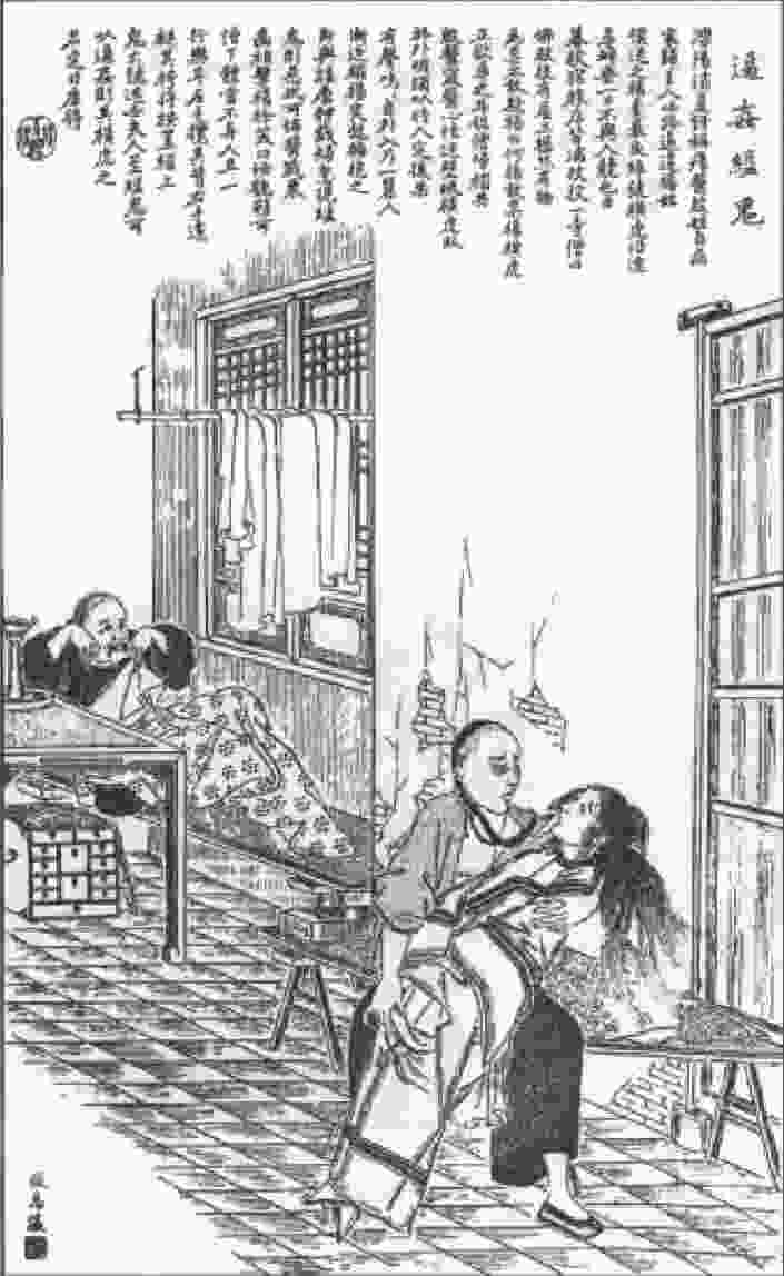《礼拜六》1914年第3期。许啸天(1886−1948) 你看他紧锁着眉心,慢慢的揭起那罗帐来,端详着美人的面庞儿。咳,可怜,可怜!你看这男子,竟在那里吊眼泪了。他又不敢放声大哭。恐怕惊醒了这位美人,更把两手掩着脸,哽咽了一阵,轻轻的伏在美人身上,俯下脖子去嘴对嘴轻轻的接了一个吻。只听得嘤咛一声,那美人翻身向里,伸出一弯玉臂,搂着香衾又睡着了。那男子便慢慢的站起来,从怀里掏出一封信来,揣在鸳鸯枕下,又对美人的背影看了一阵,微微的叹了一口气,放轻了脚步,慢慢的退出房去。 《婉转蛾眉马前死》,